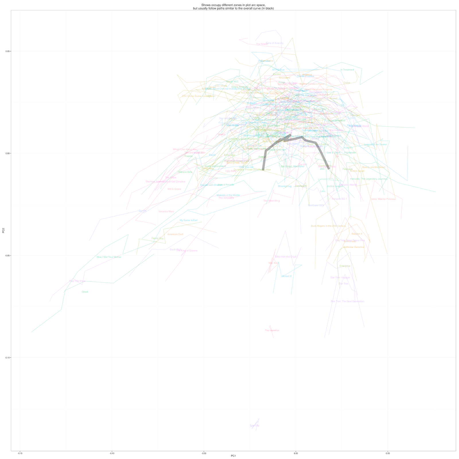 But although they trace out arcs, they do it in their portion of the plot arc space. (To really make sense out of this chart, you might have to not just click to expand, but open in a separate window, zoom in and zoom out, pan around; or, just truest me). The portions of plot-arc space they land in correspond to genre: the crime shows live in an area something like the early middle of a show, while science fiction camps out after the end of the end.