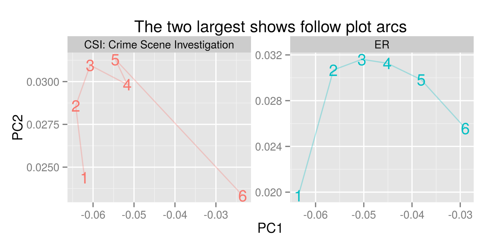 This is interesting, but there are even better ways to approach the general problem of plot arcs. These are charts of motion in two dimensional space: but we have a full 127 dimensions to move around in, one for every topic. Principal Components provides a nice way to plot them all _simultaneously. _So what I’m doing is taking a restricted set of only 6 documents, one for each sixth in screen time of all the text spoken in all of the movies or TV shows for that period: and calculating the first two components. (Forgive me for linking to one of the earliest series on this blog, a deeper explanation of PCA. And I should note that though I’m plotting 12 chunks, I use 6 chunks of screen time rather than 12 to calculate the components because of the aforementioned problems with shows under 23 minutes.).