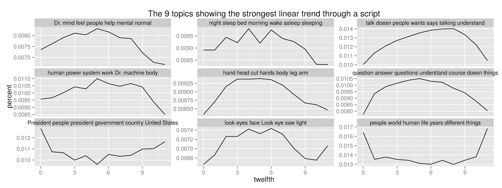 Just as words show patterns in screen time, so do topics. But since I only have 127 topics, it’s easy to search all of them for the strongest patterns. Using linear models to test fittedness to a straight line, I went through the data set to pull out the nine topics that show the strongest directionality. Here they are (click to enlarge):
