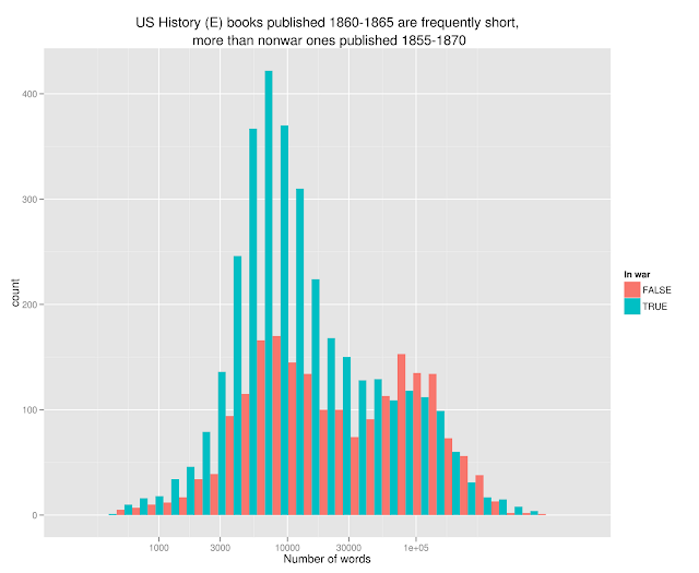 Having done that myself, I note one distinguishing feature of these ephemera: many are quite short, while real works of history tend to be fairly long. Looking at the lengths of the books confirms that the lengths of only E (US history) drops significantly in the 1860s: