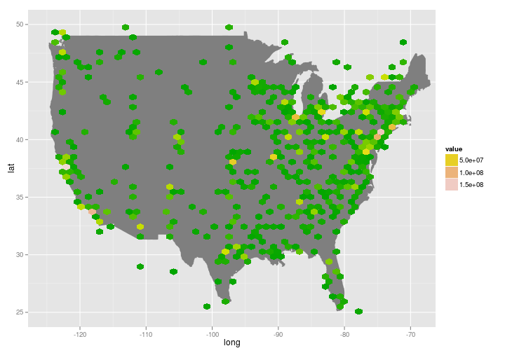To do density, it makes sense to try to bin these together somehow. One possibility is to throw down some hexagonal bins and shade them from green to white: that does a decent job at showing high concentrations in New York, Washington, Tokyo, London, etc.