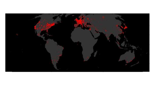 Of course, that’s just the locations of e-mail servers: there’s no sense of which universities put out the most research. We can correct that with a quick API call to Bookworm, and get some maps that show the density of words produced in each of the sets. As points, that looks like this–pretty much the same as the raw location data, but with slightly better defined clusters in Europe and on the American east coast.